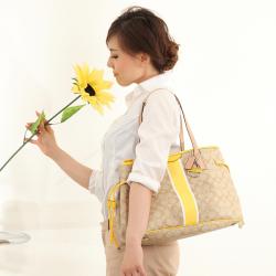 夏らしいさわやかな黄色をストライプにした、ホワイト系のお洋服にピッタリのバッグです。